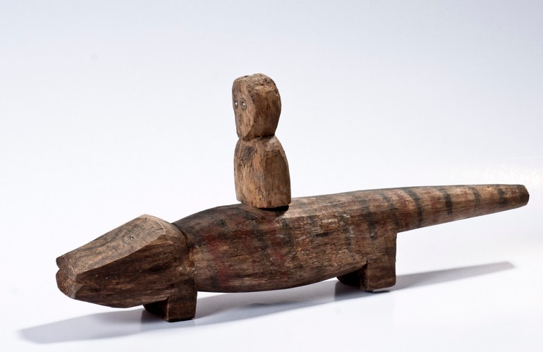 Тот же приём маркировки полосами использовался в деревянной обрядовой скульптуре. Экспонат, выполненный в 1950-х удэгейским мастером Каладо Кимонко, показывает шамана верхом на духе-помощнике (рис.4) и демонстрирует тот же принцип узнаваемости по косвенным признакам.