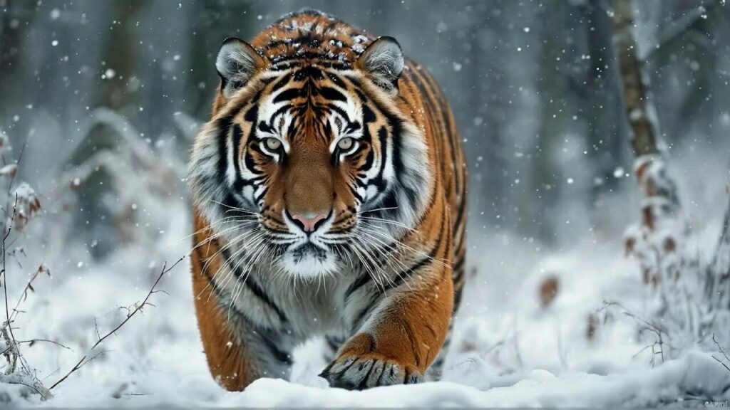 2. Амурский тигр – единственный подвид, способный выживать в суровых зимних условиях благодаря густой шерсти (вдвое плотнее, чем у бенгальских тигров), пятисантиметровой жировой прослойке и широким лапам, которые работают как снегоступы, позволяя передвигаться по глубокому снегу при температурах до –40 градусов.
